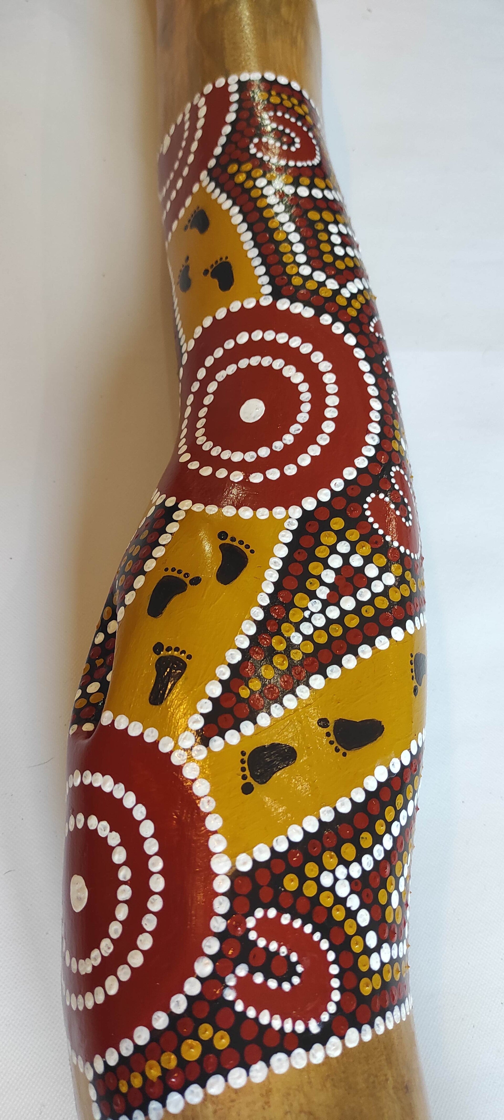 Strumento in legno di Ailanto dalla forma insolita, realizzato con la tecnica del taglio longiotudinale, decorato stile dot painting finitura satinata, imboccatura in faggio, nota di base Re#, lungo 138 cm, peso 2,5kg, strumento corposo ricco di armonici e con buon volume.